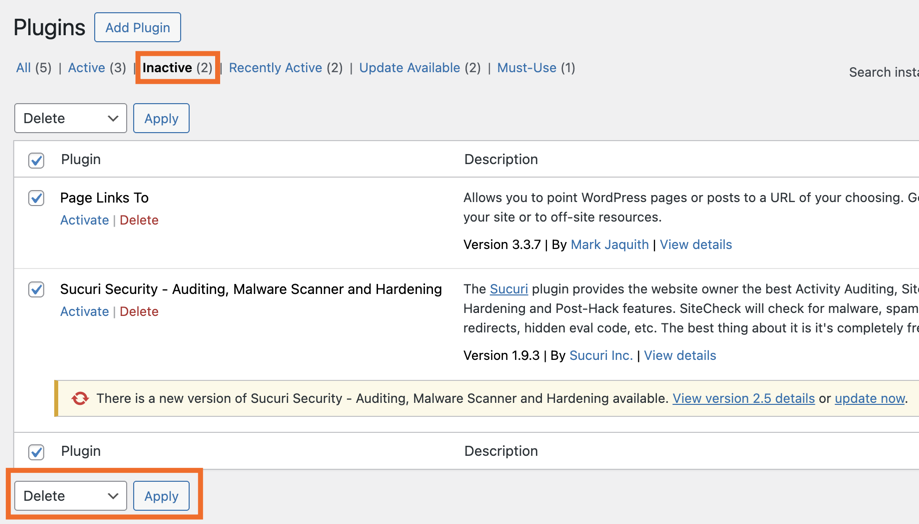 Log hiervoor in op je WordPress website en klik aan de linkerzijde op 'Plugins'. Klik vervolgens op de link 'Inactive' of 'Inactief'. Alle plugins die hier in vermeld worden zijn uitgeschakeld en kunnen zonder problemen verwijderd worden uit de website. Dit kun je doen door de desbetreffende plugins te selecteren en vervolgens in het dropdown menu de optie 'Delete' te selecteren en op de knop 'Apply' te klikken.