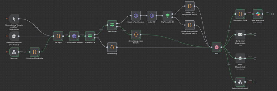Wanneer de data correct is aangeleverd aan de 'Set input' node zal de workflow vervolgens het cPanel account klaarzetten, en optioneel de WordPress installatie uitvoeren via Installatron. Het resultaat hiervan zal afhankelijk van foutmeldingen worden verwerkt in enkele code nodes waarbij de output gefinetuned kan worden. Dit gaat vervolgens naar een 'wait' node om alles combineren.