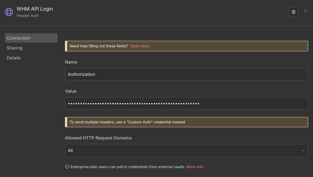 Allereerst is het belangrijk om enkele zaken te configureren. Om een connectie op te zetten met het reseller account is het eerst noodzakelijk om een WHM API key aan te vragen, en deze vervolgens in de credentials van n8n te plaatsen. Deze kun je als 'Header Auth' toevoegen, met de name 'Authorization'. De token is vervolgens een combinatie van de WHM username en de WHM API key, welke je kunt toevoegen als 'whm username:whmapikey' (zonder quotes).