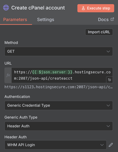 Zodra deze credentials zijn aangemaakt dienen deze verwerkt te worden in de 'Create cPanel account' en 'Create cPanel session' nodes.