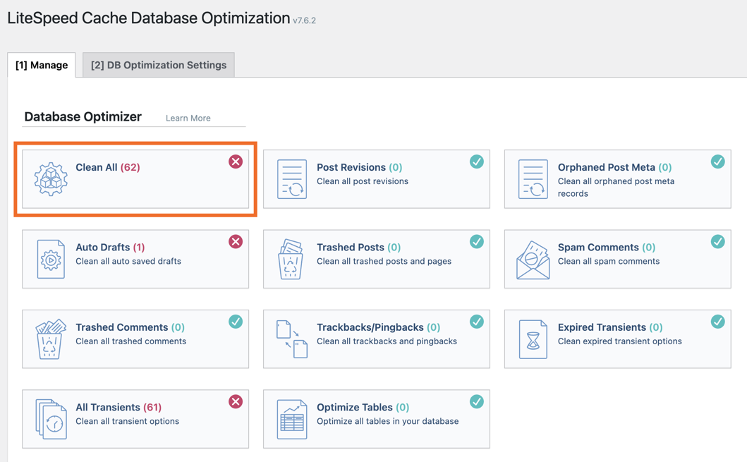 Bij gebruik van WordPress zullen er veel tijdelijke zaken opgeslagen worden in de database. Hierbij kan het zijn dat de database erg groot wordt, wat ervoor zorgt dat het doorzoeken hiervan langzamer gaat. Om dit te verhelpen kun je periodiek deze zaken opruimen vanuit de LiteSpeed plugin via 'LiteSpeed Cache > Database'. Het opruimen van deze zaken zal geen effect hebben op de werking of inhoud van je website.