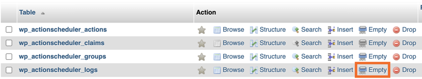 Zodra dit is voltooid kun je ook de log bestanden van de action scheduler verwijderen. Open hiervoor de desbetreffende database in phpMyAdmin en klik bij de wp_actionscheduler_logs tabel op 'empty'.