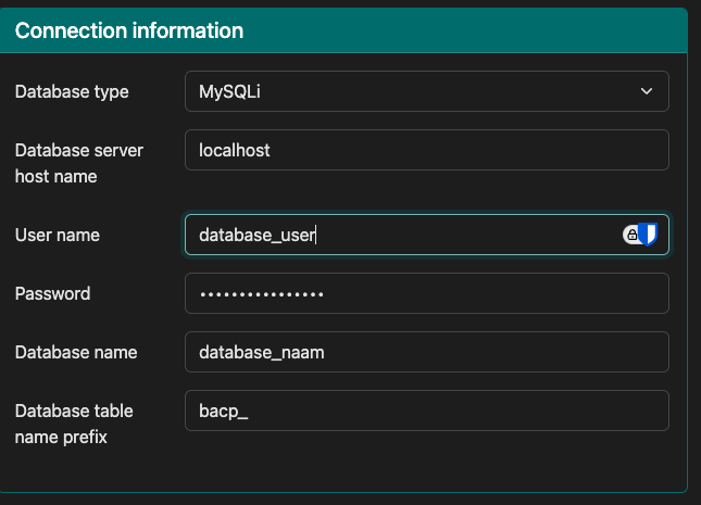 Daarna moeten de databasegegevens worden ingegeven van de eerder aangemaakte database