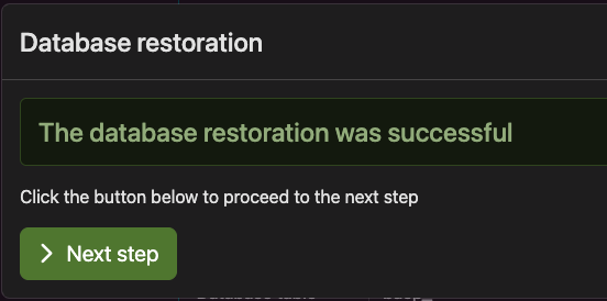 De database wordt direct hersteld, hierover krijg je een melding. Klik hier op '> Next step'