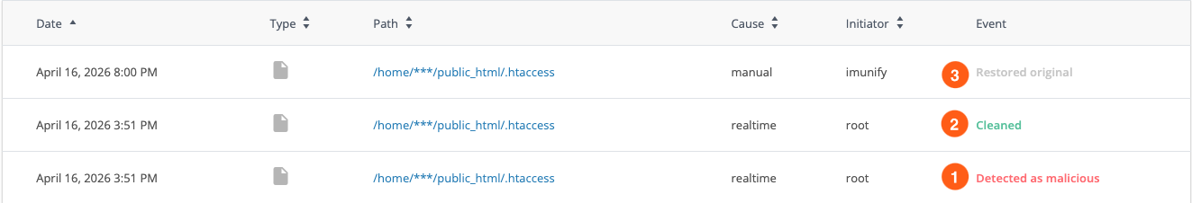 Status: “restored original” + initiator Imunify