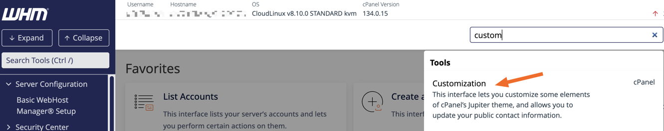 - Ga naar je WHM Reseller omgeving en vervolgens naar → Customization