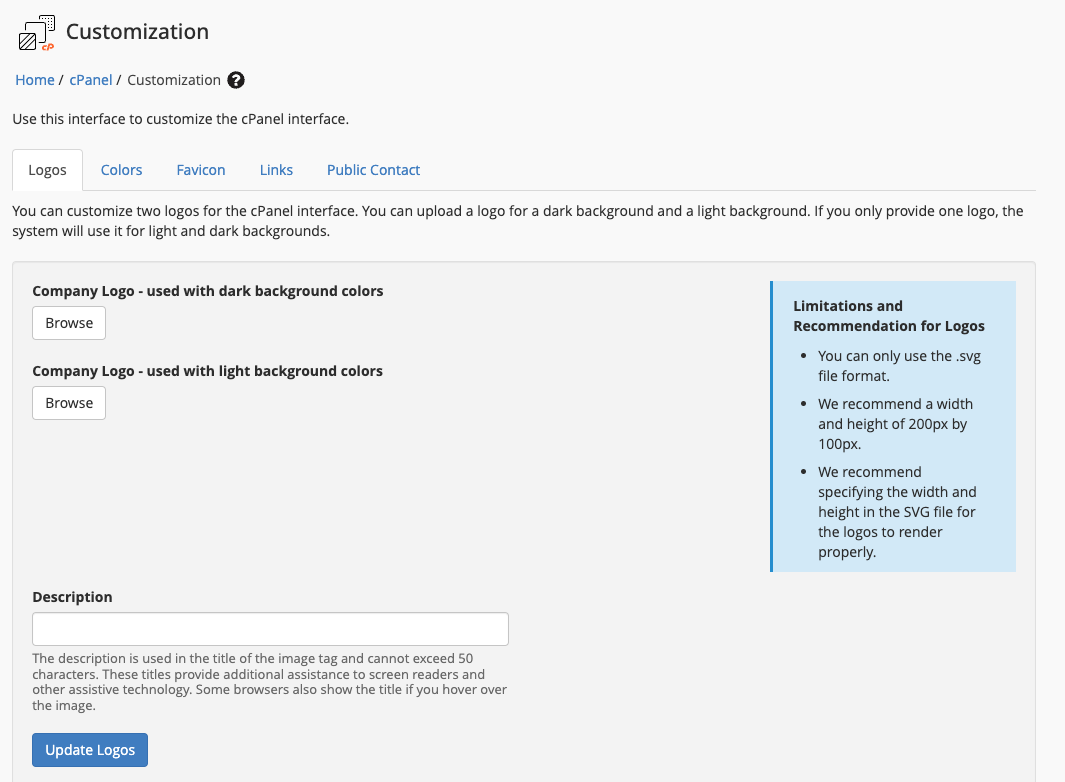 - In het eerste tabblad kun je de logo's kiezen welke gebruikt zullen worden in de cPanel accounts.