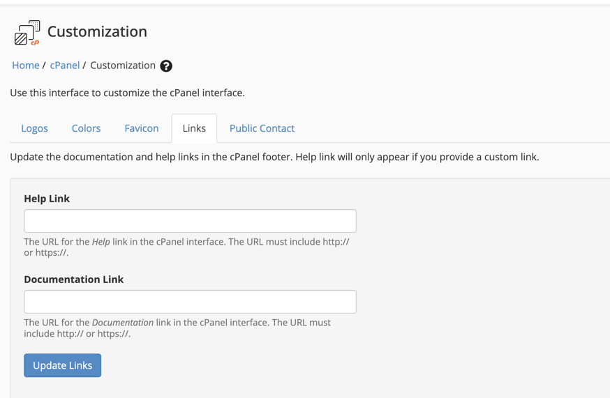 Optioneel kun je de footer links in cPanel aanpassen, zoals de standaard links voor ‘Documentation’ en ‘Support’, en vervangen door verwijzingen naar je eigen website.