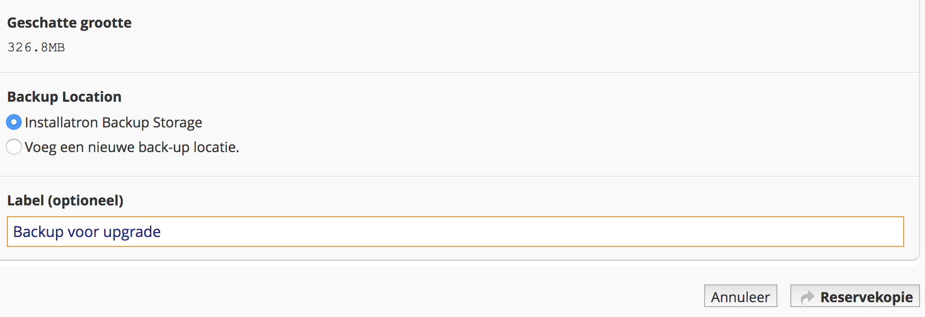 Je komt dan in het volgende scherm. Je ziet de geschatte grootte, je kunt een andere backuplocatie kiezen en hebt dan de mogelijkheid een label (naam) aan je backup te geven, bijvoorbeeld: Backup voor upgrade dd-mm-jjjj. Klik dan op de Reservekopie knop.